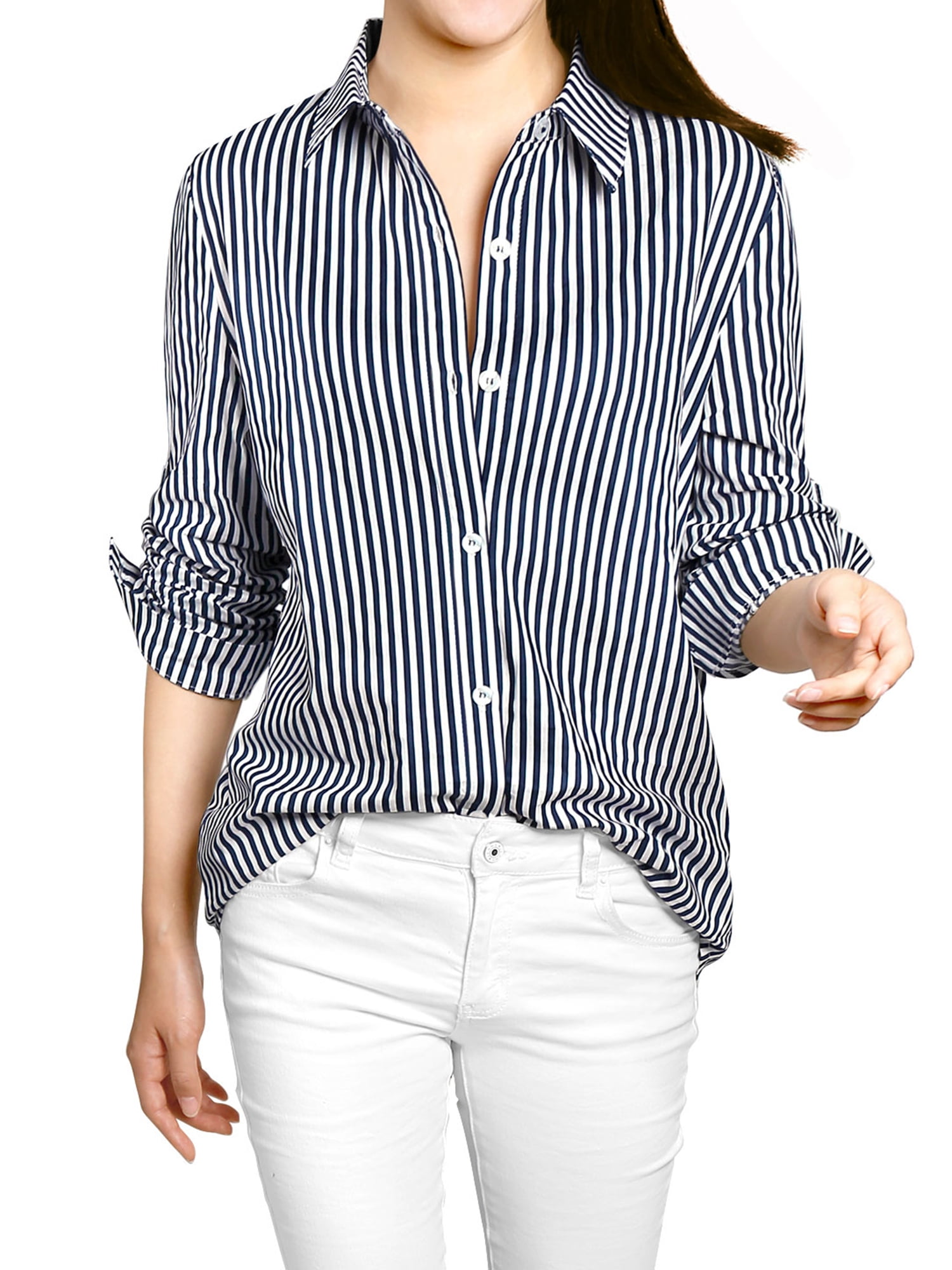 Stylish Turn Down Collar Long Sleeve Vertical Striped Loose Fitting Blouse For Women Blouses For Women Vertical Striped Shirt Fashion